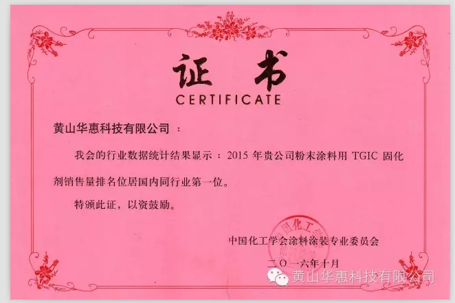 根據(jù)中國化工學(xué)會涂料涂裝專業(yè)委員會進(jìn)行的2015年度行業(yè)統(tǒng)計,華惠公司粉末涂料用TGIC固化劑銷售量排名位居國內(nèi)同行業(yè)第一位。